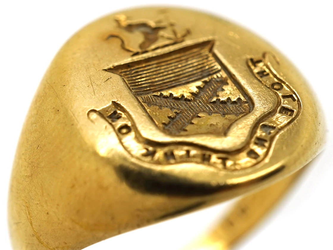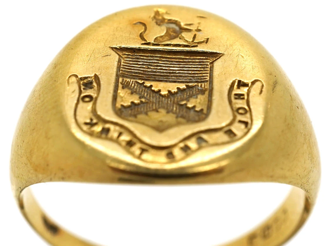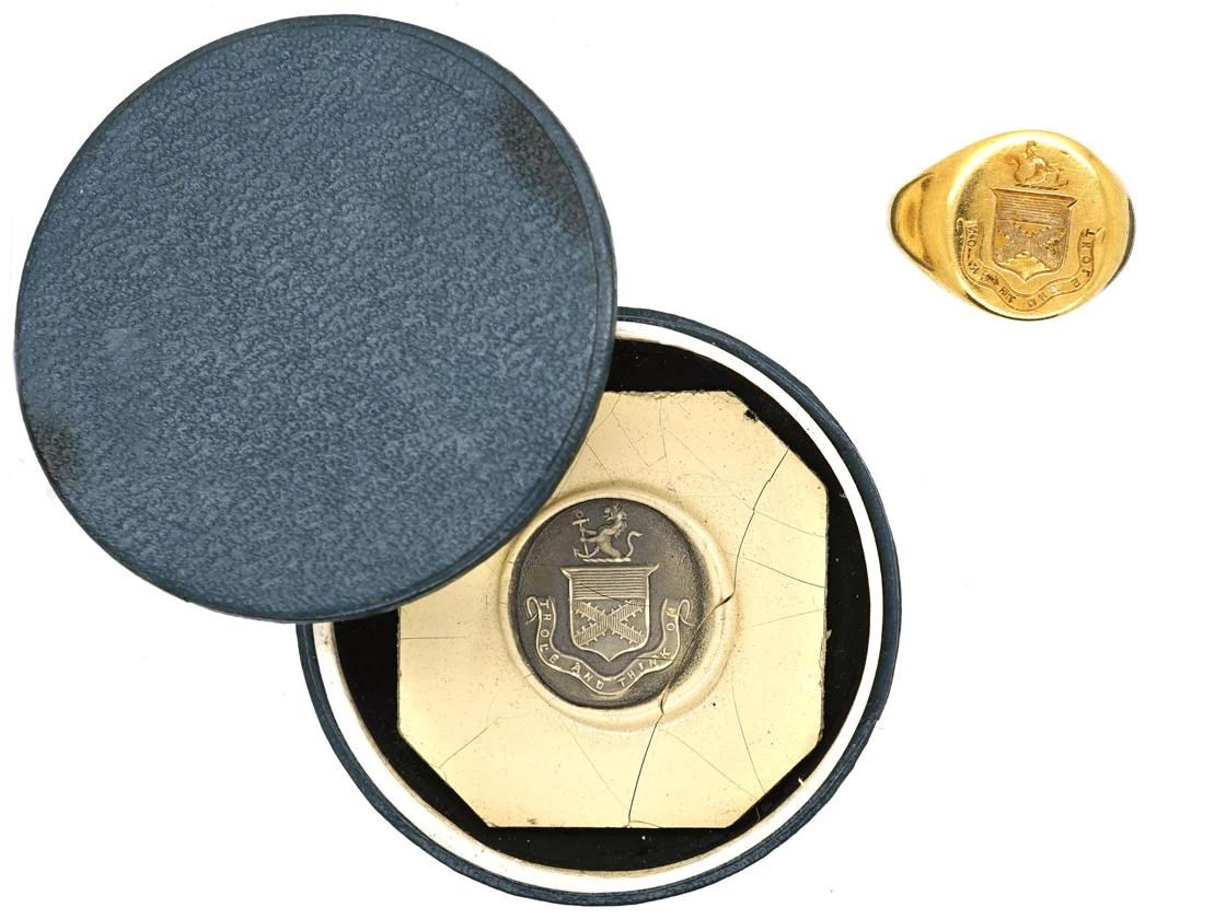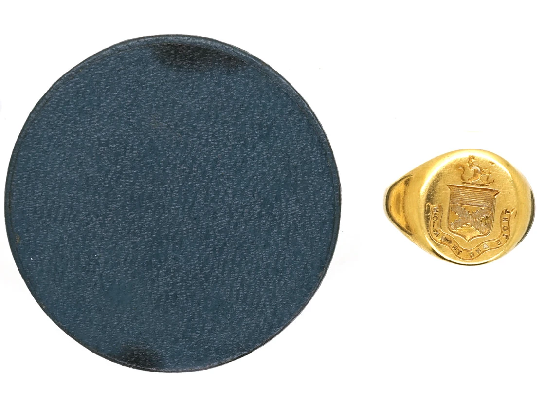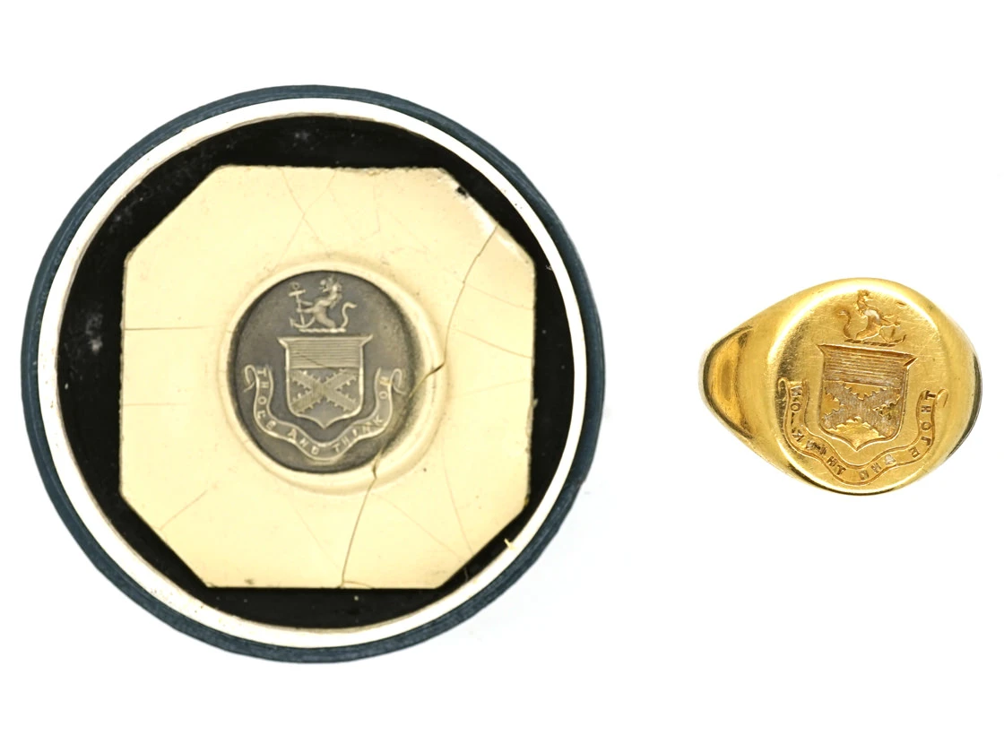 An 18ct75% pure gold (or 750 parts pure gold and 250 parts other metals) gold signet ringA ring with a central plaque on which one’s initials, a seal, or a crest is engraved. with the Arms of Clan Tweedie. The motto of the family is “Thol and Think” (“Thole” is an old Scottish word meaning “suffer” or “endure”). Tweedie or Tweedy is a Scottish clan name. The name is derived from the lands of Tweedie which were along the Valley of the River Tweed in Peebleshire in the Scottish Borders. The Tweedies have a history of being a powerful and domineering family, whose principal seat was Drumelzier in Tweeddale. The first recorded Tweedie is John de Tueda as he describes himself in the reign of Alexander II (1214–1249), who afterwards had a Charter from Alexander III (1249–1286), granted him under the name of John de Tuedy. He was the owner of lands on the River Tweed from which the family took their name, and even then the family connections and possessions were widespread and powerful. This ring comes with it’s die in a little round box.