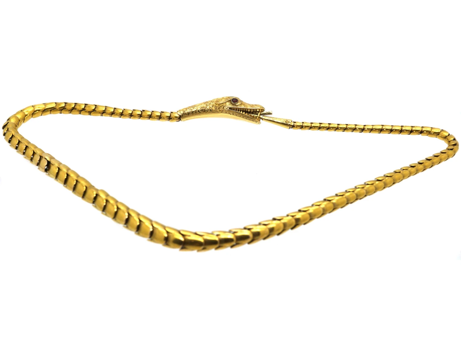 A good 18ct gold snake necklace that was made circa 1860-1880. The chain is graduated like a snake’s body and the clasp enters the snake’s mouth.. The snake’s head has been beautifully engraved and has been set with two cabochon cut garnets for the eyes. Most Victorian jewellery is full of hidden meanings. In the Victorian era it became very fashionable to wear snake jewellery after Prince Albert proposed to Queen Victoria with the very first engagement ring, which was in the image of a snake with an emerald set head.