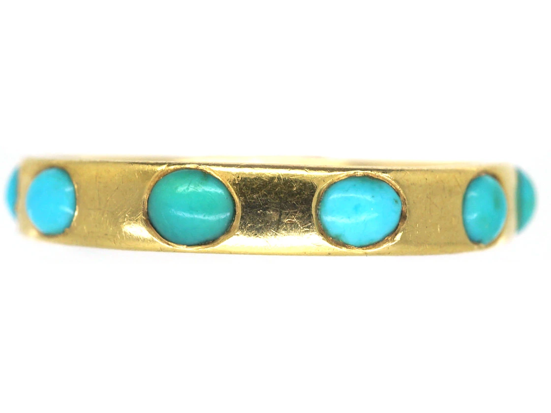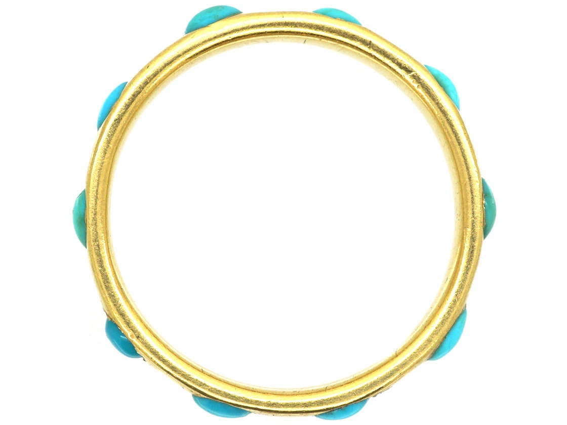A really pretty 18ct75% pure gold (or 750 parts pure gold and 250 parts other metals) gold ring set with ten oval turquoiseTurquoise is an opaque gem and is often formed in what is called matrix, a black or brown veining derived from the host rock in which the gem forms. In fine jewellery, unblemished sky blue turquoise is the ideal, although regularly patterned matrix turquoise is also sought-after. stones.The meaning is told through the choice of the stones as they are the colour of the “forget me not” flower so this ring would have been given as a token of admiration and love. It was made circa 1860.