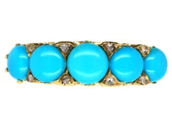 A smart 18ct75% pure gold (or 750 parts pure gold and 250 parts other metals) gold late VictorianJewellery made in the the Victorian era (1839-1901). ring made circa 1890-1900. It is set with five well matched turquoiseTurquoise is an opaque gem and is often formed in what is called matrix, a black or brown veining derived from the host rock in which the gem forms. In fine jewellery, unblemished sky blue turquoise is the ideal, although regularly patterned matrix turquoise is also sought-after. with small rose diamondA precious, lustrous gemstone made of highly compressed carbon. Diamonds are one of the hardest materials known to mankind. Colours of diamonds range from colourless, yellow, orange and brown to almost black. Natural coloured (or ‘fancy’) diamonds can be extremely rare. The cut, colour, clarity and carat weight of a diamond are the criteria jewellers use… pointsA unit of weight for a diamond, being one-hundredth of a metric carat. It is used for weights that are decimal fractions of a carat, and all figures after the second decimal point are, in the diamond and jewellery trade, generally discarded. on either side, which give the ring a good line. The shankThe circle of metal that attaches to the decorative part of a ring and encircles the finger. is called a half hoop because it has a decorated edge on both sides. It is in lovely condition.
