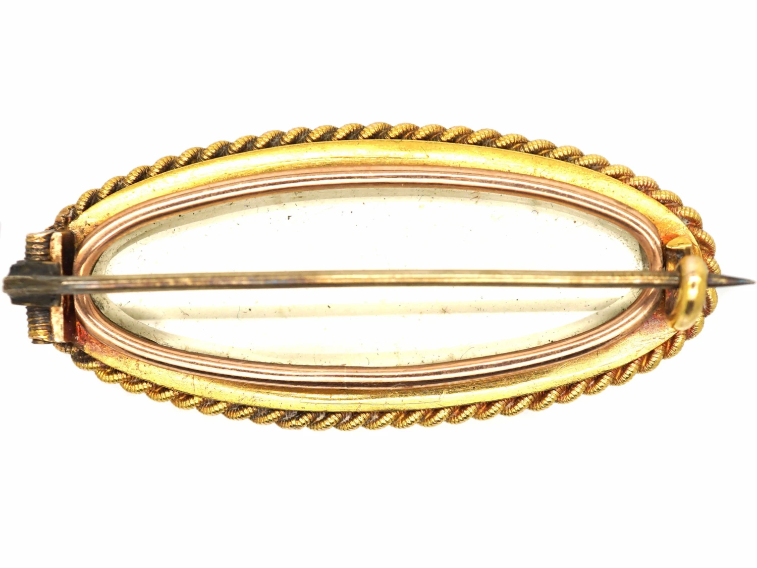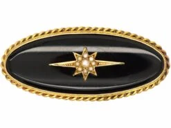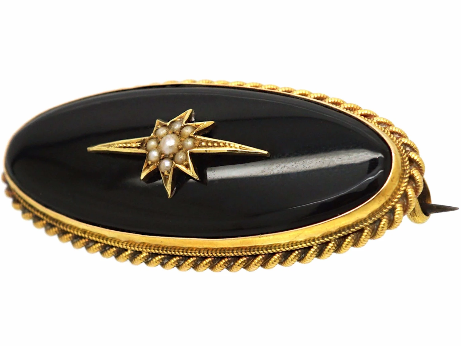 A good quality 18ct75% pure gold (or 750 parts pure gold and 250 parts other metals) gold brooch that was made circa 1880. It has been set with onyxOnyx is an opaque black variety of polycrystalline chalcedony quartz. with an applied star motif that has been set with graduated naturalA natural stone is called such because it has not been subjected to any treatments. split pearls. Around the edge is a twisted rope design. On the reverse is a glazed locket. These brooches would have been worn in memory of someone but nowadays they are a great addition to a jacket or dress.