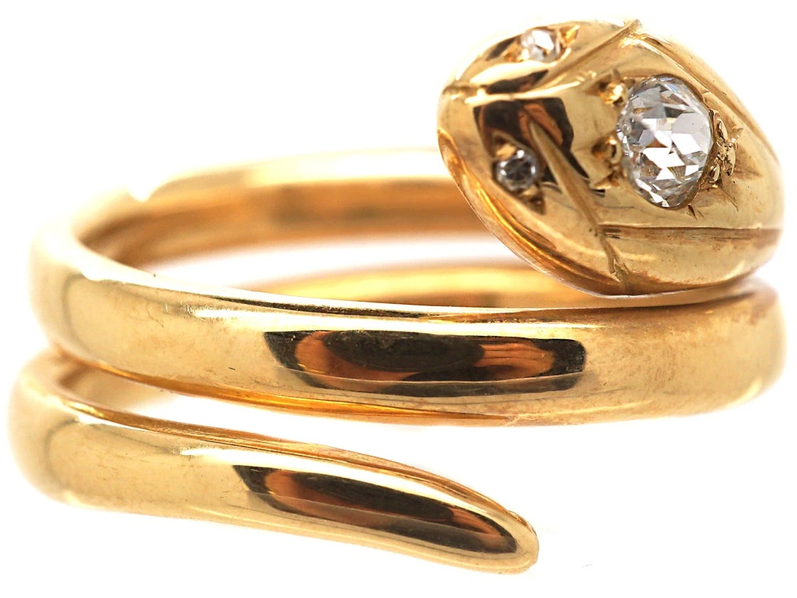 A good 18ct75% pure gold (or 750 parts pure gold and 250 parts other metals) gold double coiled snake ring set with a quarter of a caratThe unit of weight for a diamond or other gemstone and also for a pearl. Abbreviated ‘ct’, 1 carat is equal to 0.2 grams. In reference to gold, a unit of purity or fineness of gold and gold alloy, expressed as a number out of 24 parts by weight, e.g. ’24 carat’ signifies pure gold, ’18 carat’ 18/24th gold in the alloy, et cetera. Also abbreviated as ‘c… old mine cutAn 18th, 19th and early 20th century diamond shape, typically cushion or asymmetrical, marked by a small table, a high crown and a large culet. Culets are the small flat facets at the bottom of a stone which appear to the untrained eye as a hole in the middle of the stone. Before the advent of modern machinery which allows for the precise faceting we see tod… diamondA precious, lustrous gemstone made of highly compressed carbon. Diamonds are one of the hardest materials known to mankind. Colours of diamonds range from colourless, yellow, orange and brown to almost black. Natural coloured (or âfancyâ) diamonds can be extremely rare. The cut, colour, clarity and carat weight of a diamond are the criteria jewellers use… in itâs head and two small diamonds in itâs eyes. It was made circa 1880. The snake motif in antiqueFrom the Latin ‘antiquus’, meaning ‘old and long in existence’, it is generally used to refer to collectible artifacts of at least 100 years of age.