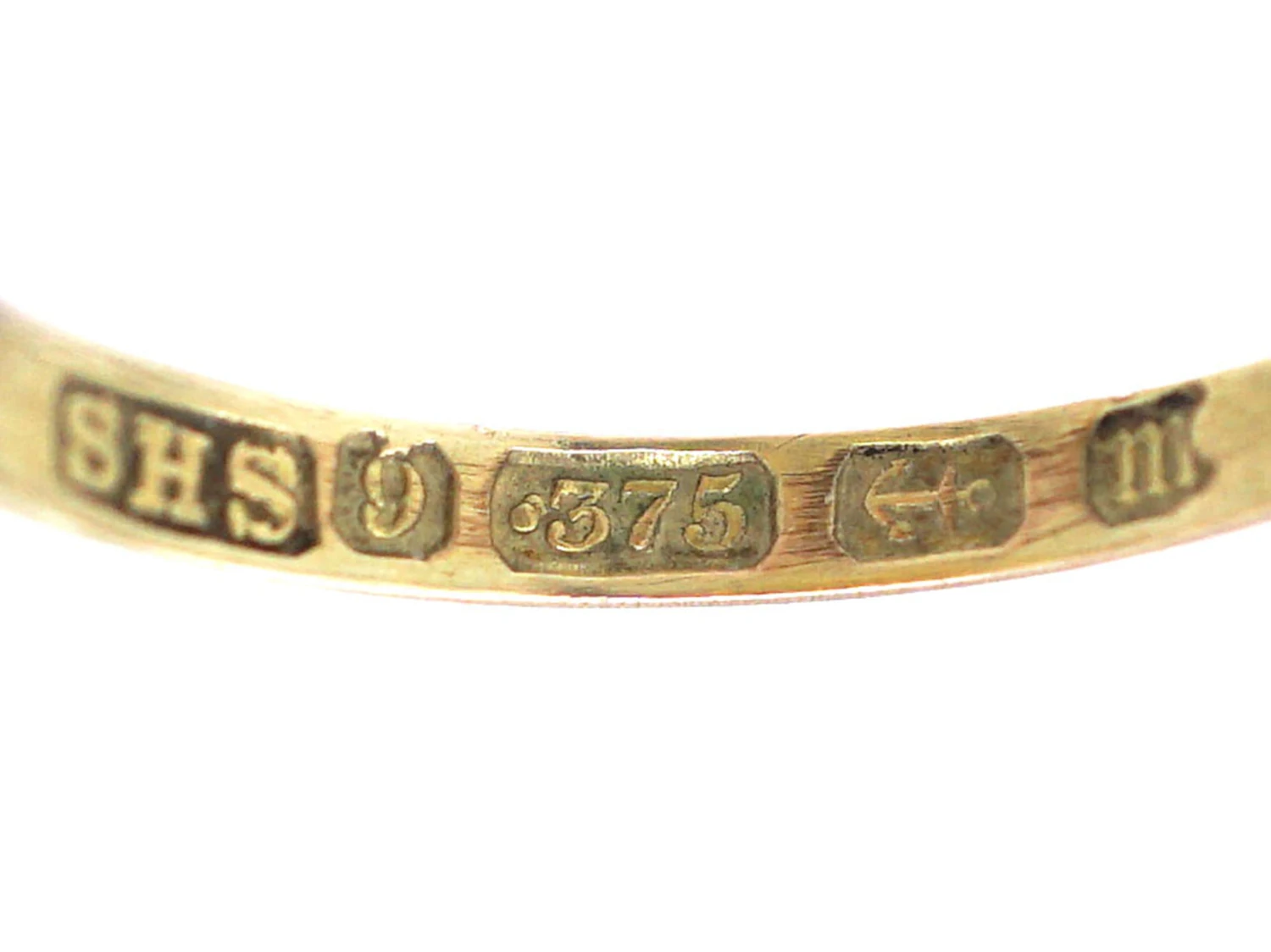 A charming 9ct37.5% pure gold (or 375 parts pure gold and 625 parts other metals) gold ring that was made in Birmingham in 1886. The first letter of each gemstone spells “Dearest” DiamondA precious, lustrous gemstone made of highly compressed carbon. Diamonds are one of the hardest materials known to mankind. Colours of diamonds range from colourless, yellow, orange and brown to almost black. Natural coloured (or ‘fancy’) diamonds can be extremely rare. The cut, colour, clarity and carat weight of a diamond are the criteria jewellers use…, EmeraldOne of the four ‘precious’ stones. An intense, deep green is the most desirable colour for emeralds. Flaws and cloudiness (‘jardin’) are very common in emeralds, so stones are often oiled, irradiated, and dyed to improve their look. Synthetic emeralds have fewer imperfections and are hard to set apart from natural stones. Emeralds belong to the beryl…, AmethystAmethyst is the purple variety of macrocrystalline quartz. From the Greek amethystos meaning ‘a remedy against drunkedness’, it was believed to prevent intoxication and ensure the wearer retains a clear head and quick wit. It was once considered as valuable as ruby, sapphire and emerald., RubyOne of the most valuable gemstones on earth. From the corundum family, the red variety being ruby and the blue, sapphire. With the exception of the diamond, corundum is the hardest of the gemstones on the Mohs scale scoring a 9., Emerald, SapphireBlue is the best-known colour for this gemstone but it can be found in all colours of the spectrum. After diamond, sapphire is the hardest gemstone.