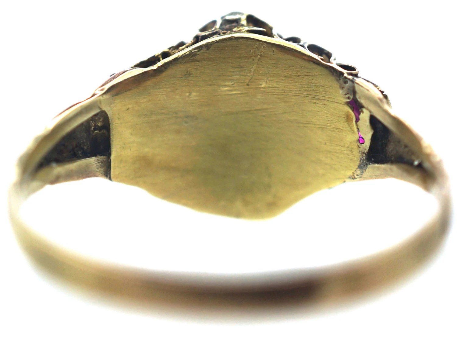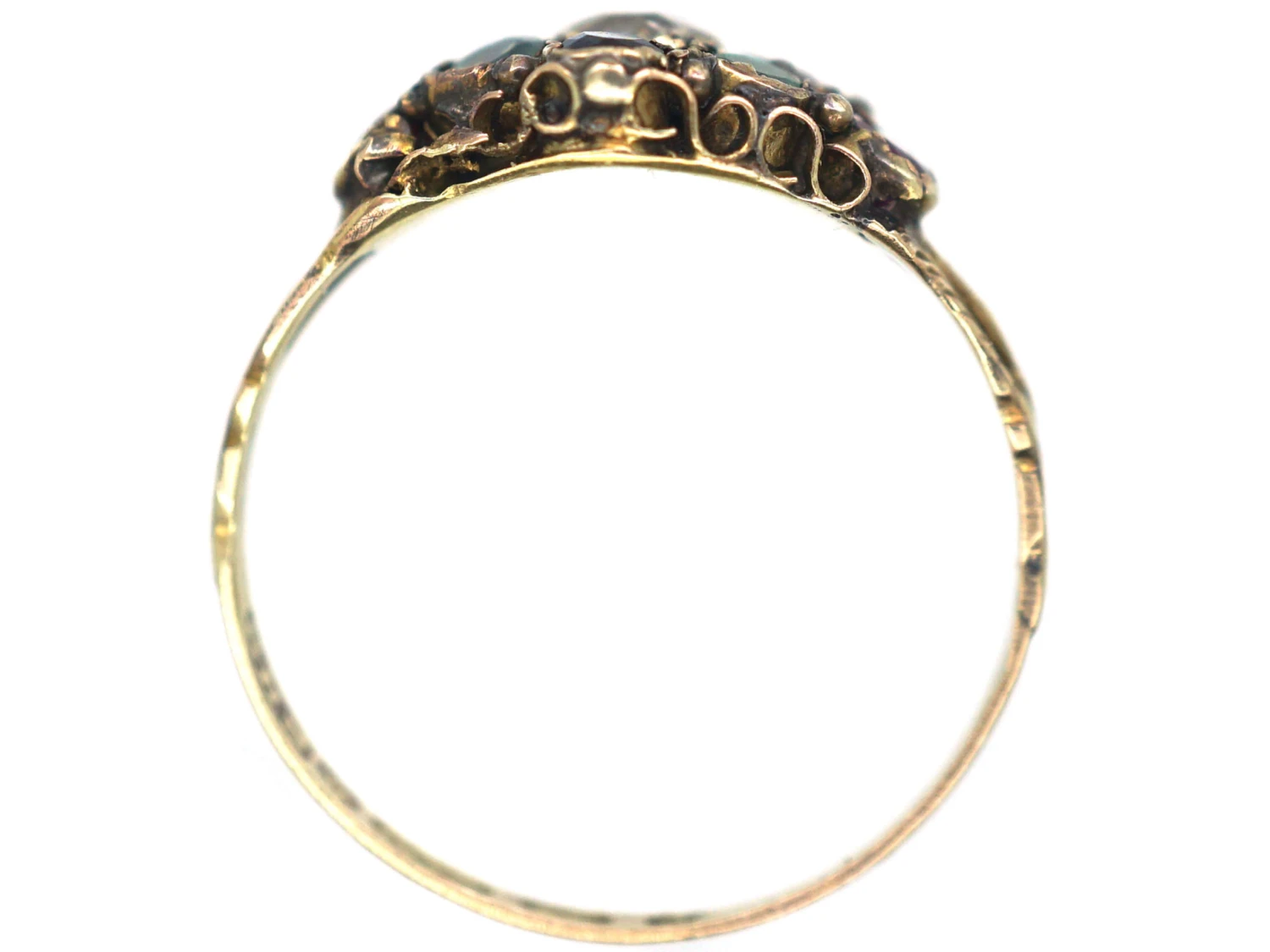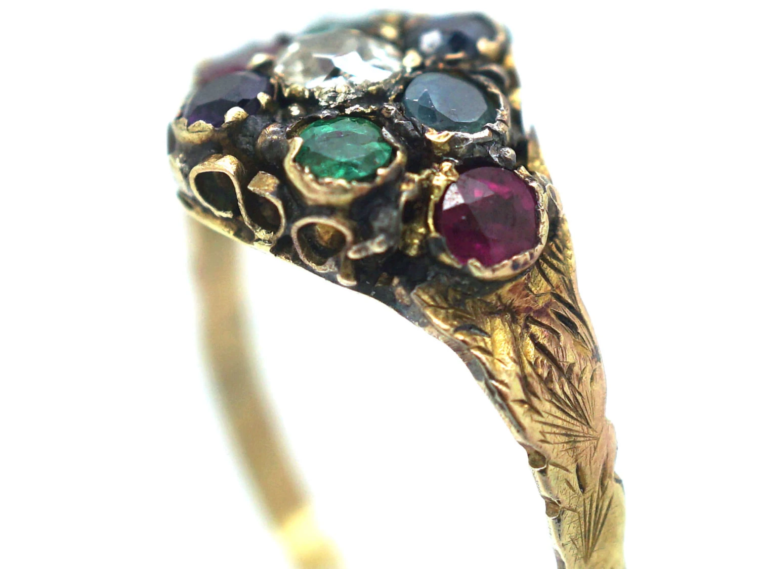 , TopazIt comes in many colours, including brown, green. blue, yellow, red, pink and orange. Topaz is very hard, being 8 on the Mohs scale, with a high cleavage. . The Georgians and Victorians were very fond of sending secret messages to their loved ones and rings such as this one also spelt “Adore, Regard, Love” etc. It also has an added ruby for “true love” on either side of the clusterA group of small diamonds or colourful gemstones grouped together to form a cluster, mimicking the look of a larger gem. Often this group can surround a larger center stone. just to get the pointA unit of weight for a diamond, being one-hundredth of a metric carat. It is used for weights that are decimal fractions of a carat, and all figures after the second decimal point are, in the diamond and jewellery trade, generally discarded. over! The shankThe circle of metal that attaches to the decorative part of a ring and encircles the finger. has fine engraved leaves on the shouldersThe point on a ring where the central section meets the shank or band, often carved, decorated or inlaid with small diamond accent stones.. It would make a lovely gift.