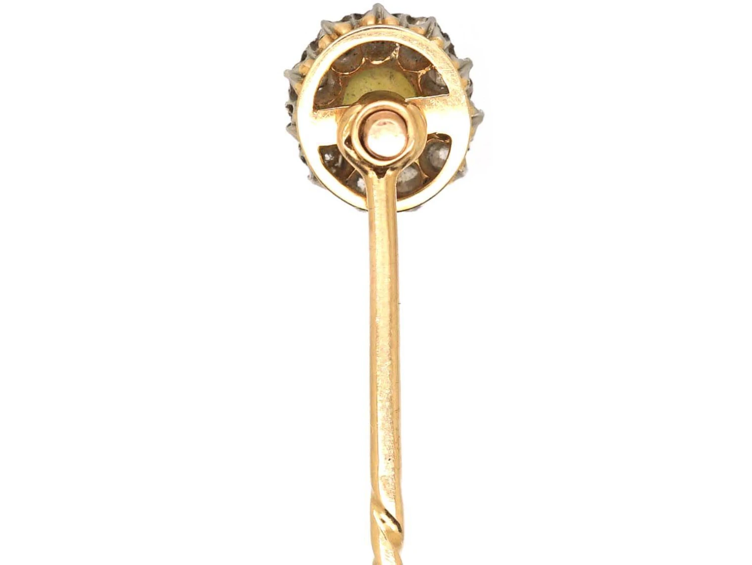 An unusual tie pin that has been set with a cat’s eyeA general term for several varieties of gemstones that, when suitably cut en cabochon and viewed in a certain direction and light, show chatoyancy resembling a moving streak of light as seen in a cat’s eye. The streak is caused by reflection from parallel layers of asbestos fibre or from minute internal canals. chrysoberylA hard stone that ranges in colour from yellow, to brown, to green. Alexandrite and Cat’s Eye are both notable types of Chrysoberyl. surrounded by eleven diamonds. Cat’s eye chrysoberyl is a rare and valuable stone and is only found in a few deposits in the world, hence it has been featured in this tie pin. It screws on to the top of the pin so it can be unscrewed if wanted. All our tie pins come with a stopper at the end