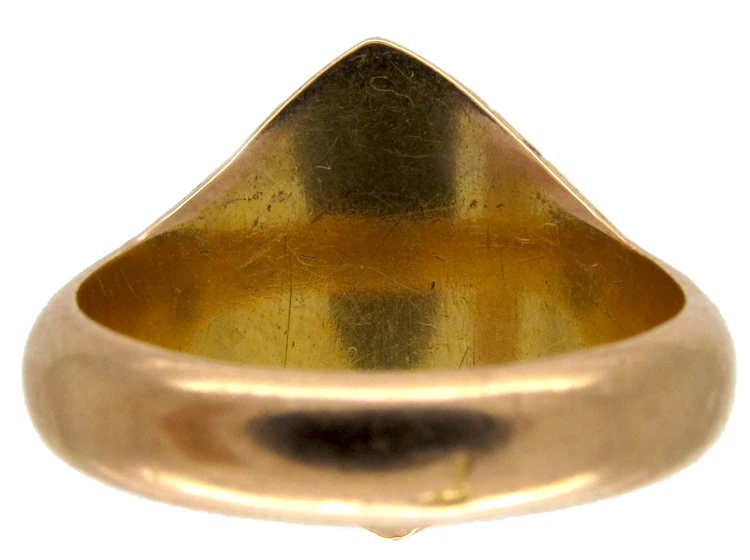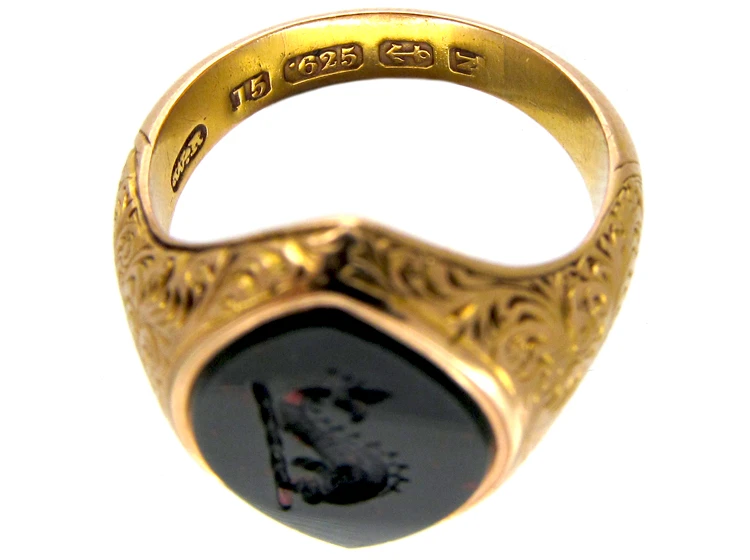 A beautiful and unusual VictorianJewellery made in the the Victorian era (1839-1901). signet ringA ring with a central plaque on which one’s initials, a seal, or a crest is engraved. which is set with an almond shaped bloodstoneA dark green to dark bluish-green variety of Chalcedony that is splattered with red or brown spots that resemble blood. The extent of the marking varies depending on the stone. Spots are favoured over larger stripes and markings.. It has been engraved with a stylised dolphin which is most attractive. The shankThe circle of metal that attaches to the decorative part of a ring and encircles the finger. is 15ct62.5% pure gold (or 625 parts pure gold and 375 parts other metals). Popular during the Victorian, Edwardian and Art Deco eras but was discontinued in the mid-1930s. gold.