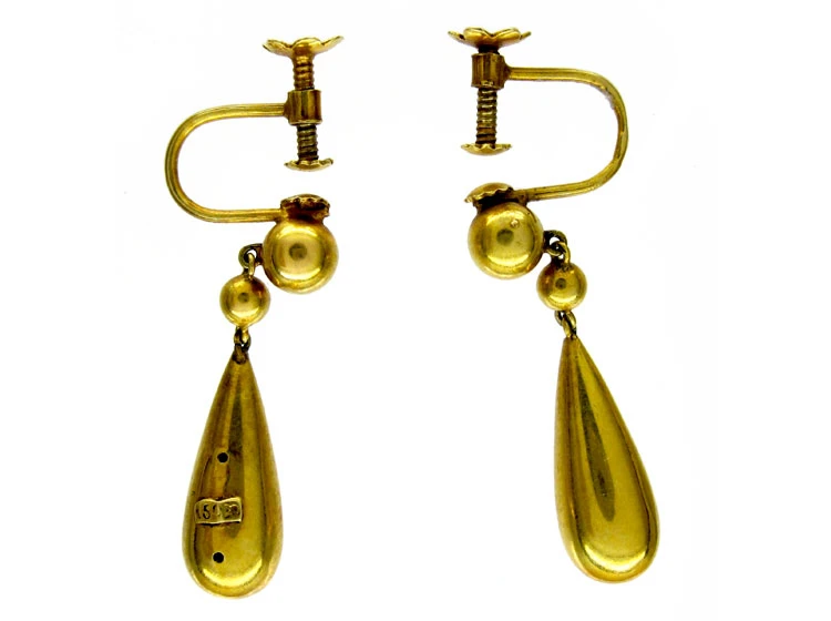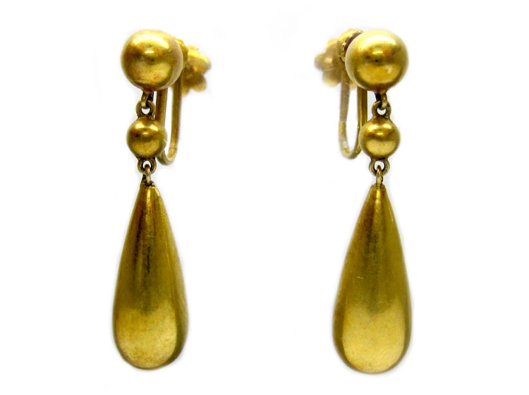 These earrings are plain classic drops, circa 1870, with screw back fittings, which were probably altered from the original wires. These can easily be turned back into pierced fittings if wished. The condition is good.