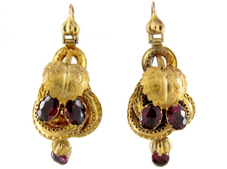 A good pair of early VictorianJewellery made in the the Victorian era (1839-1901). gold earrings which are in a leaf and swirl design, and are set with almandineA variety of red garnet that is transparent and commonly deep crimson with tinges of purple. Its colour can resemble that of ruby. It is cut in several forms; when cut en cabochon (usually as hollow cabochon to lighten the colour), it is called carbuncle. garnets. They are in excellent condition.