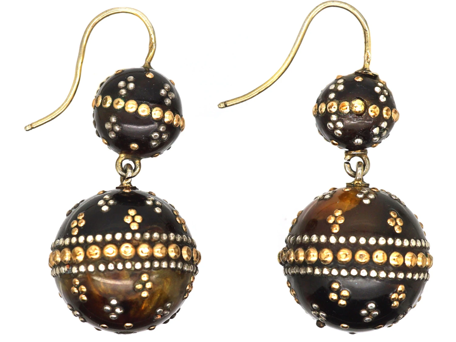 A fine pair of tortoiseshell drop earrings delicately inlaid with silver and gold. This art was perfected in the Victorian era. The tortoiseshell was heated and the metals pressed in and allowed to cool under light pressure.