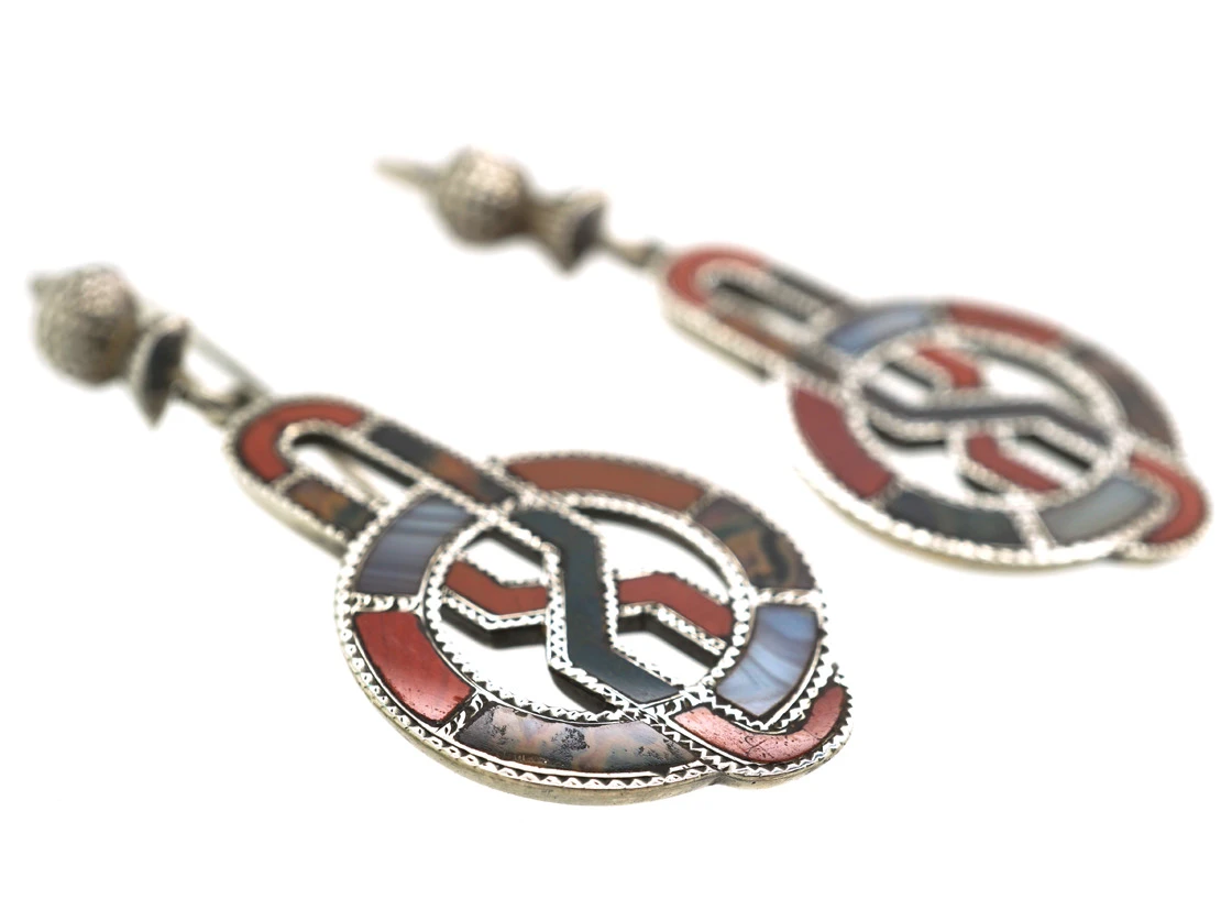 Scottish earrings with thistles at the top and an interwoven design below set with different agates such as jasperAn opaque variety of Chalcedony and is brown, yellow, or reddish, but may be used to describe other opaque colours like dark or mottled green, orange, and black. Jasper is almost always multicoloured and patterned in a unique way. and bloodstoneA dark green to dark bluish-green variety of Chalcedony that is splattered with red or brown spots that resemble blood. The extent of the marking varies depending on the stone. Spots are favoured over larger stripes and markings.. They were made circa 1860-1880. This style grew up around Queen Victoria’s purchase of Balmoral Castle in 1860. Many pieces were made as tourist trinkets to the travellers who flocked to the Cairngorms to discover the beauty and serenity of the Scottish mountains.