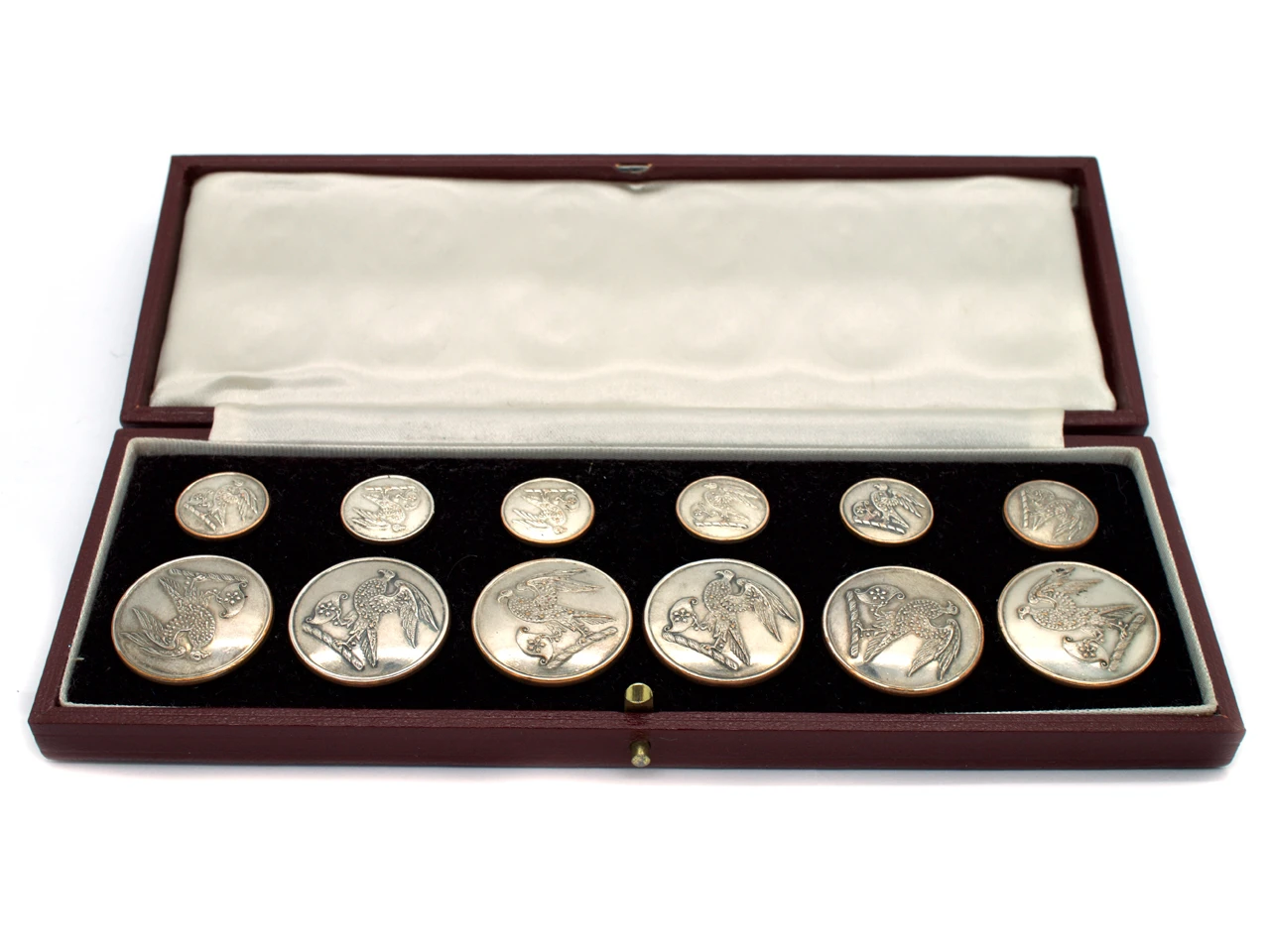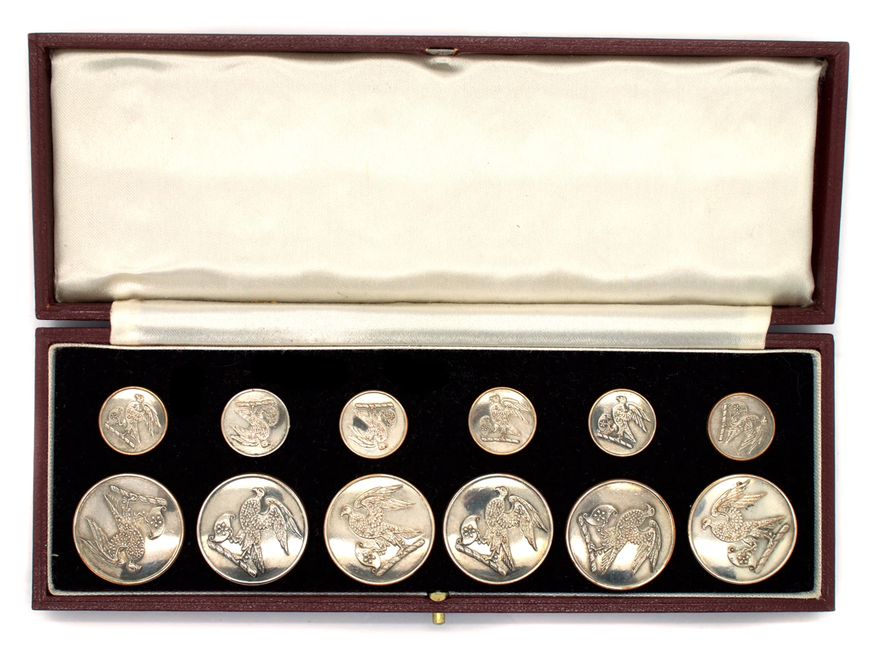 Spanning the reigns of 16 British Monarchs, Firmin & Sons, at the age of 360 years, can be said to be one of the 25 oldest established companies in the United Kingdom and is among the 500 oldest companies in the world. They have produced some of the finest values over the years. This set has six large and six small values with a crest of an eagle. They may well have been made for a High Sheriff. They are silverA metallic element which is malleable and ductile, and white in colour, making it ideal for use in jewellery. It is usually mixed with copper to improve its hardness.