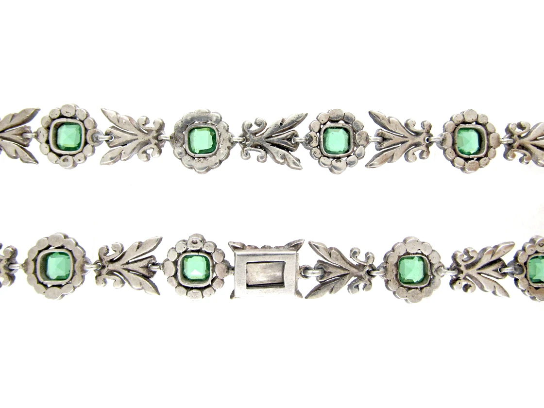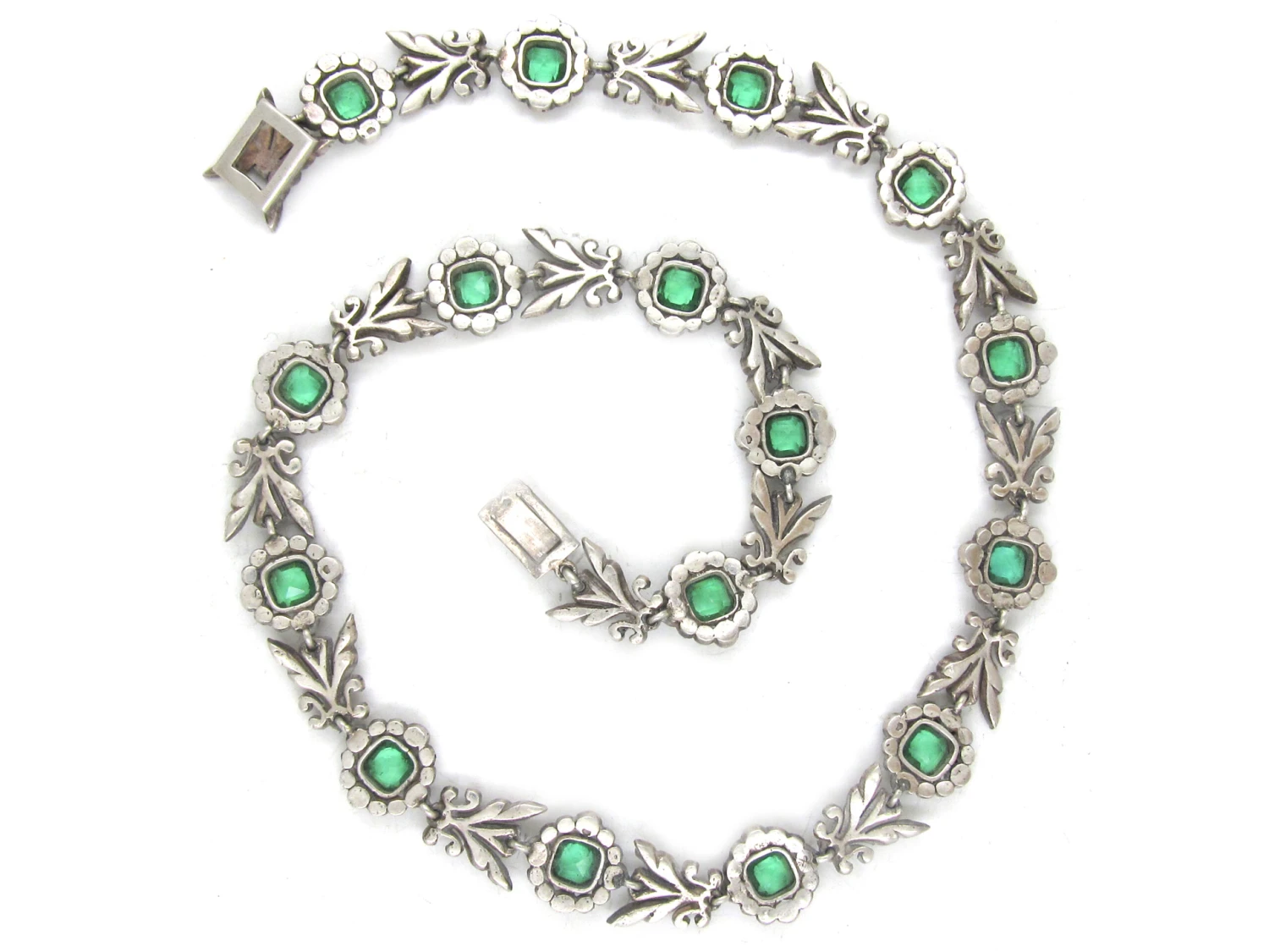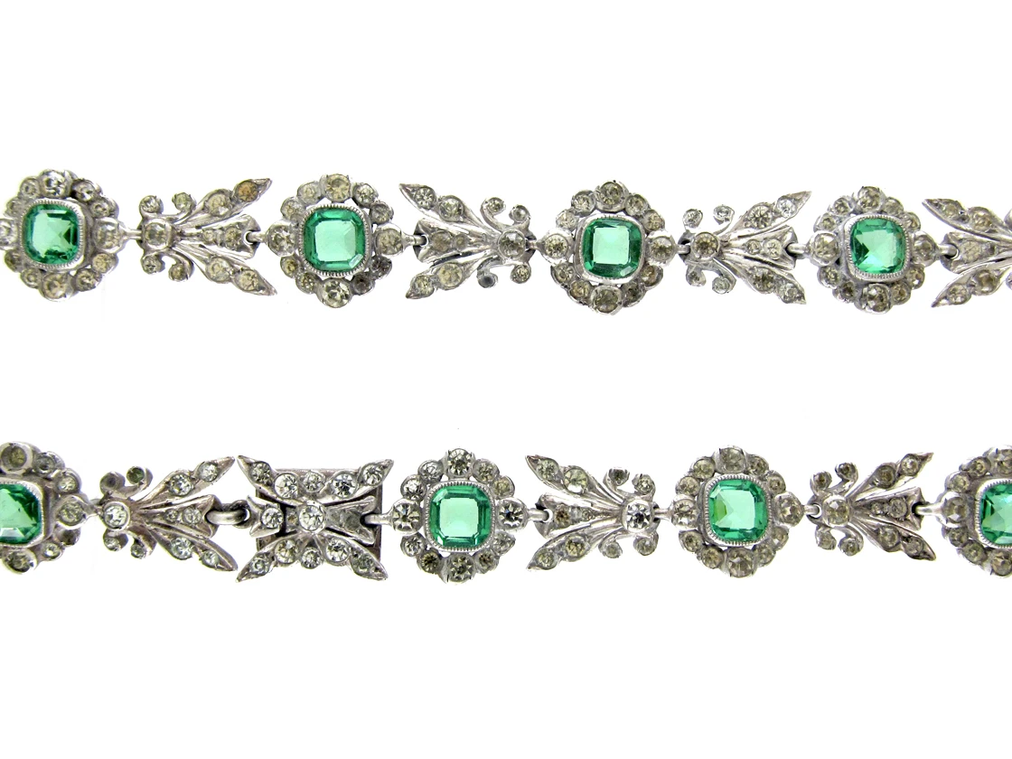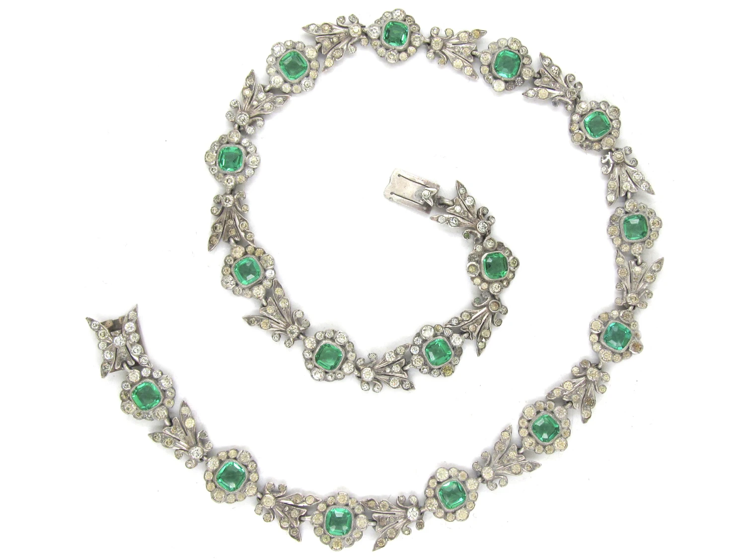 A beautiful necklace which was made circa 1890. It may have been a special commission to copy an original diamondA precious, lustrous gemstone made of highly compressed carbon. Diamonds are one of the hardest materials known to mankind. Colours of diamonds range from colourless, yellow, orange and brown to almost black. Natural coloured (or ‘fancy’) diamonds can be extremely rare. The cut, colour, clarity and carat weight of a diamond are the criteria jewellers use… and emeraldOne of the four ‘precious’ stones. An intense, deep green is the most desirable colour for emeralds. Flaws and cloudiness (‘jardin’) are very common in emeralds, so stones are often oiled, irradiated, and dyed to improve their look. Synthetic emeralds have fewer imperfections and are hard to set apart from natural stones. Emeralds belong to the beryl… piece. This was a common practice in the VictorianJewellery made in the the Victorian era (1839-1901). era. It is silverA metallic element which is malleable and ductile, and white in colour, making it ideal for use in jewellery. It is usually mixed with copper to improve its hardness.