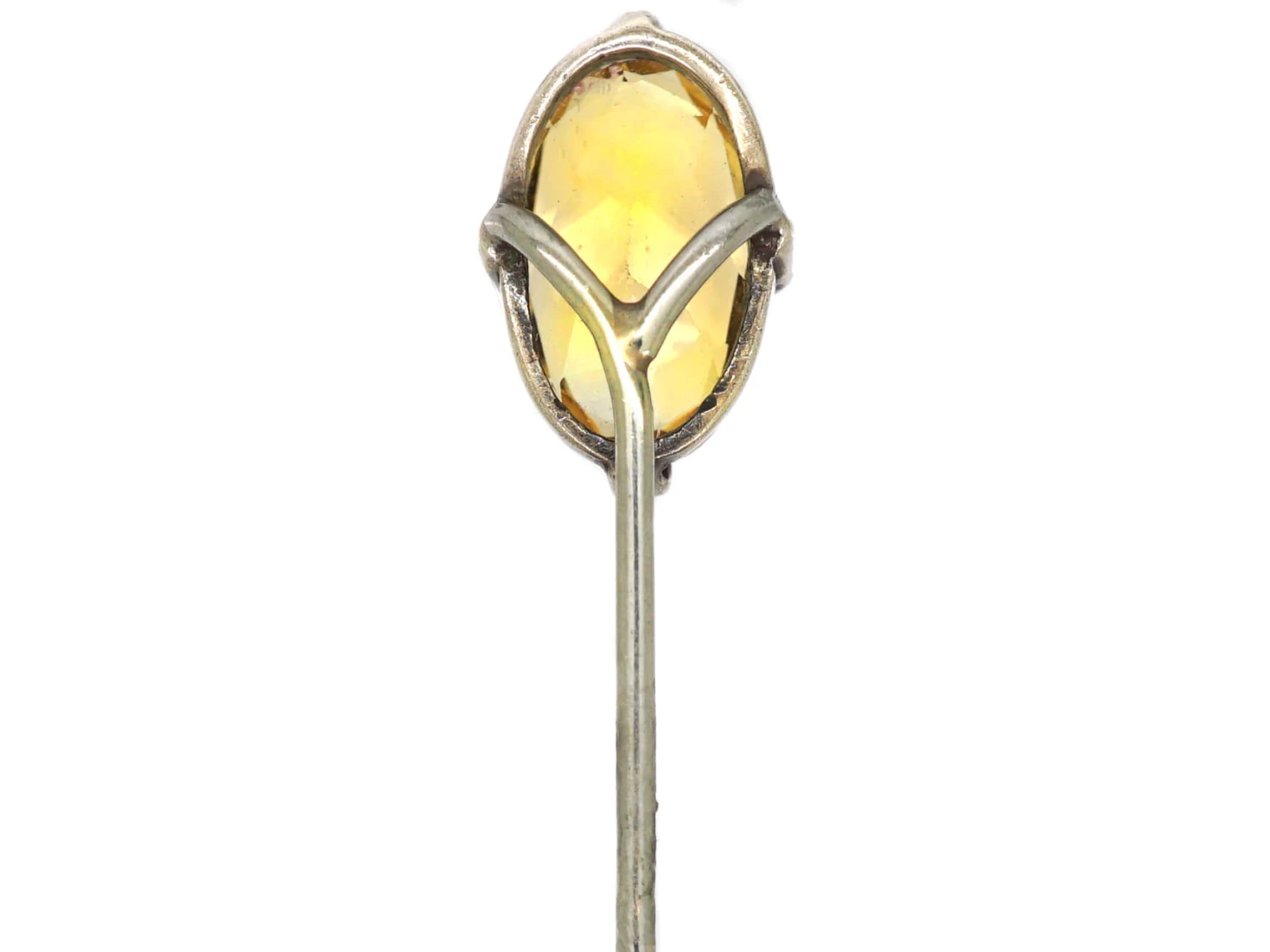 tie pin that was made circa 1880-1900. It has been set with an oval facetedA faceted stone has small, flat-cut surfaces that make a sparkling effect on transparent stones. Facets act as both mirrors and windows. Reflecting light and channelling light into a stone where it refracts and re-emerges. citrineCitrine (from the French for ‘lemon’) is a rare, yellow type of quartz, a semi-precious stone that ranges in colour from pale yellow to orange to golden brown. The best quality citrine is found in Brazil. that weighs approximately three caratsThe unit of weight for a diamond or other gemstone and also for a pearl. Abbreviated ‘ct’, 1 carat is equal to 0.2 grams. In reference to gold, a unit of purity or fineness of gold and gold alloy, expressed as a number out of 24 parts by weight, e.g. ’24 carat’ signifies pure gold, ’18 carat’ 18/24th gold in the alloy, et cetera. Also abbreviated as ‘c…. Citrine is the birthstoneEach month has a particular gemstone associated with it. Each stone is thought to be lucky for the person born in that month. for November so maybe it would be a wonderful gift to a november birthday boy!