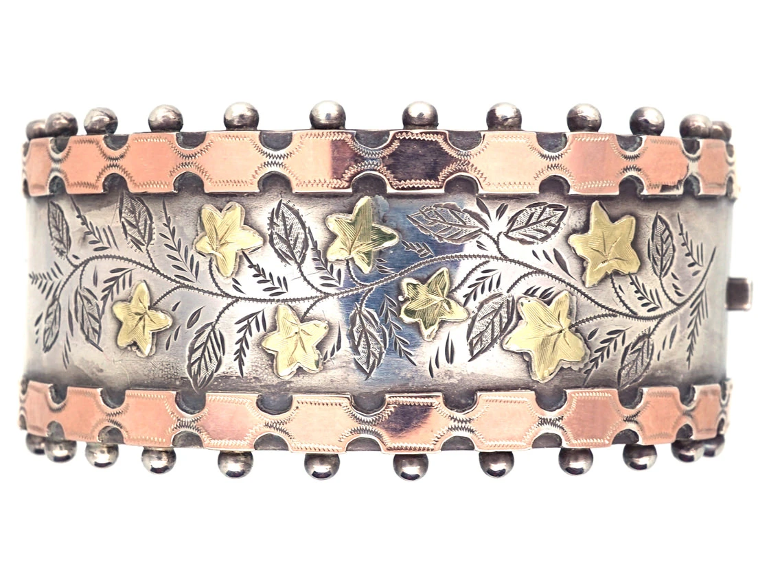 and two colour gold overlay bangle. The design is ivy leaves meaning “I cling to you” in yellow gold on a engraved silver background. On either side a rose goldA gold of any carat alloyed with copper or copper and silver, to give a pinkish or rosey colour or hue.