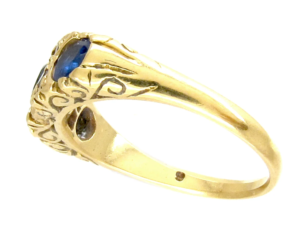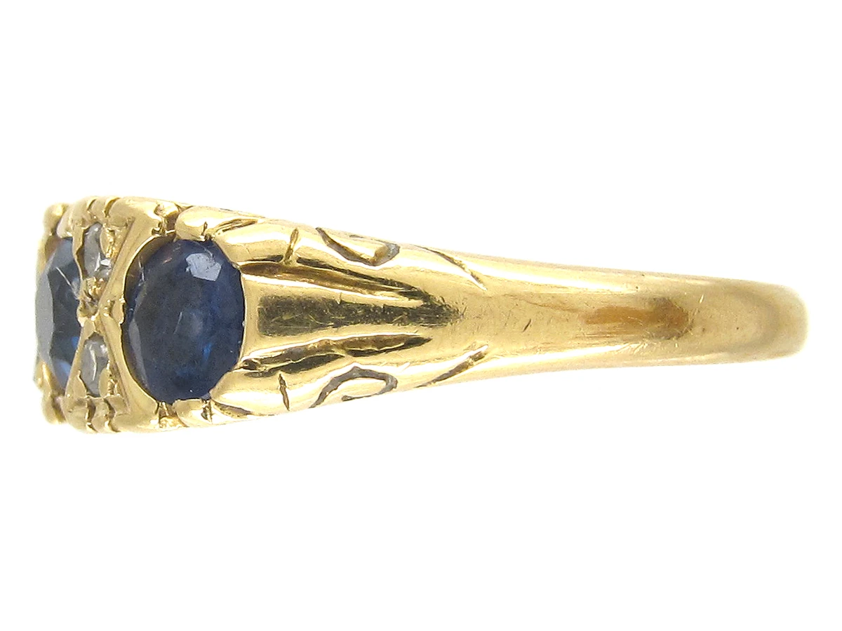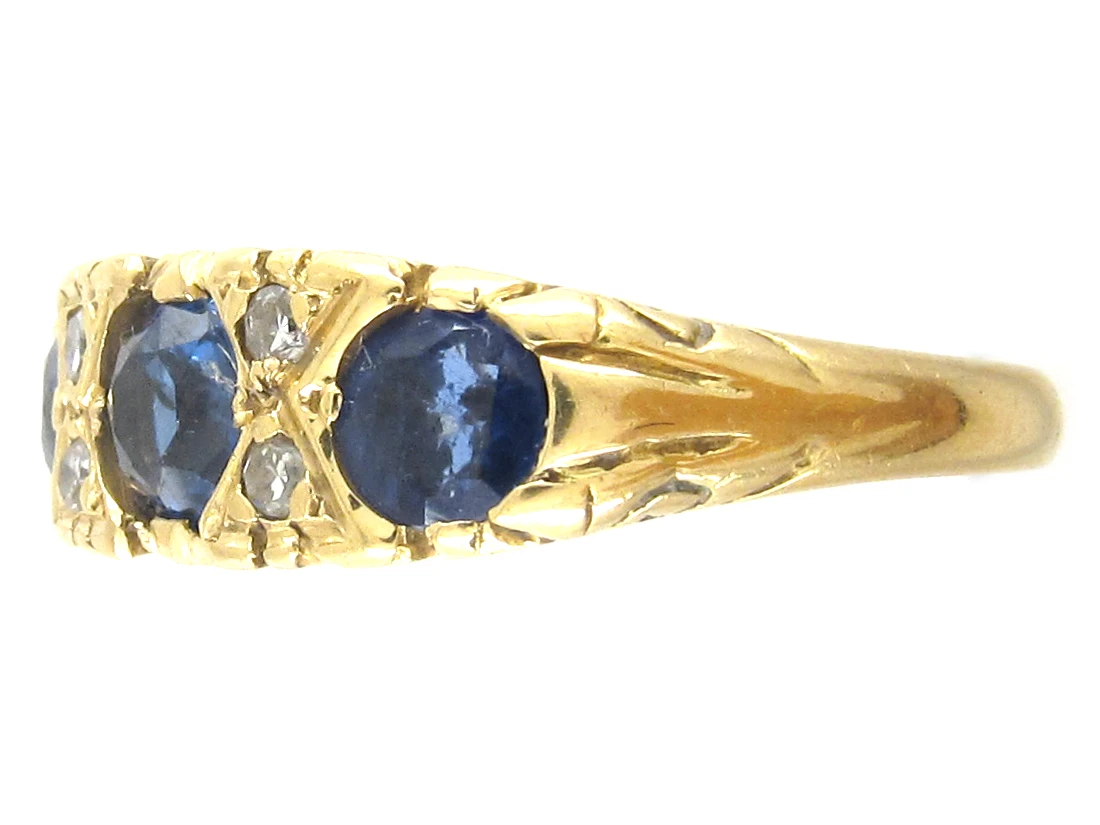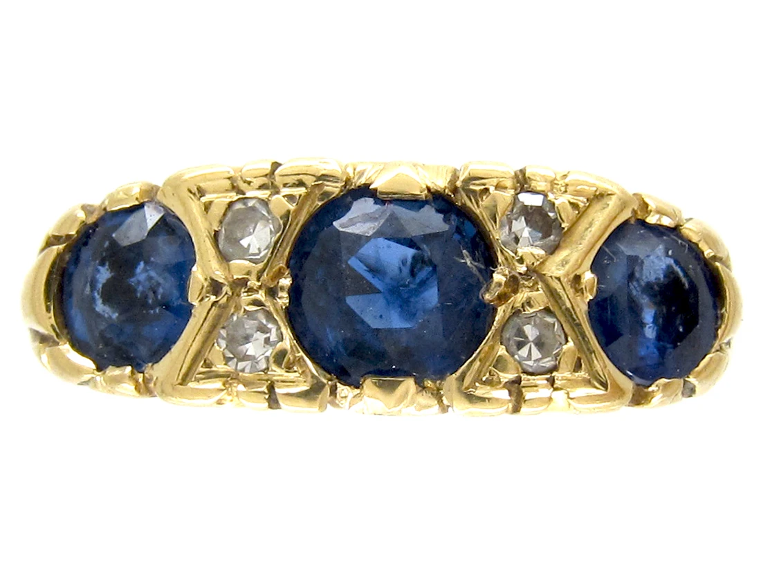 A traditional VictorianJewellery made in the the Victorian era (1839-1901). ring set with three matching naturalA natural stone is called such because it has not been subjected to any treatments. sapphires (most probably of Burmese origin), with small diamonds in between. It would make a pretty engagement ring.