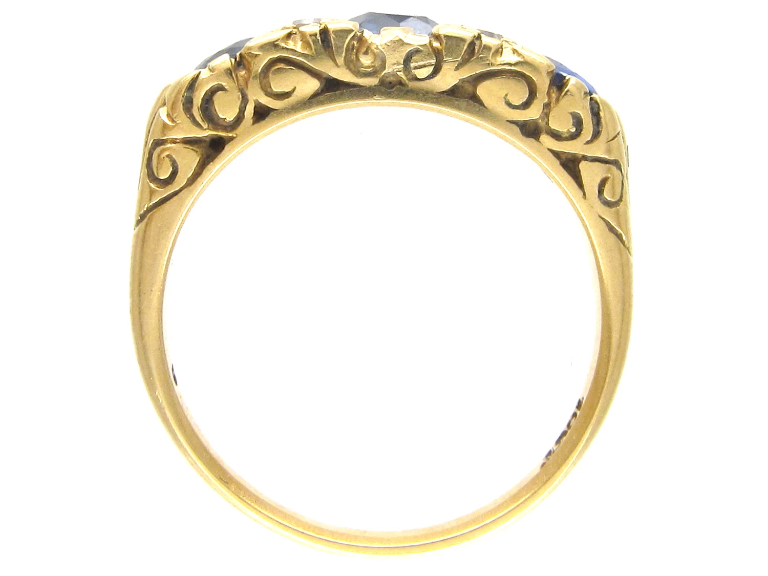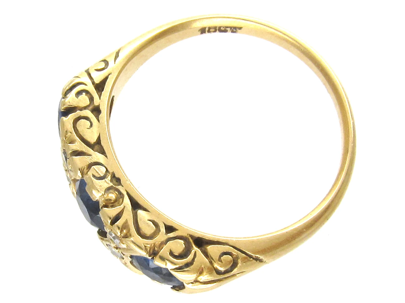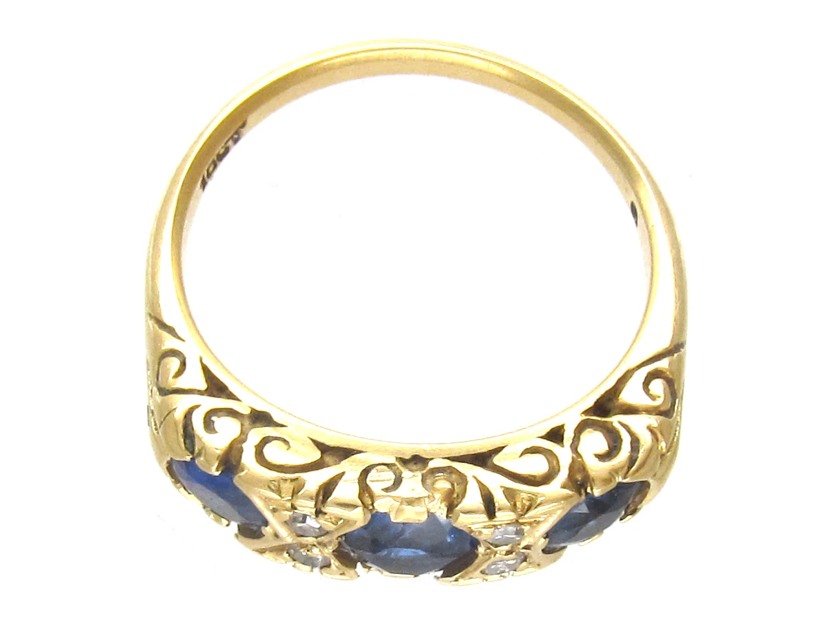 A traditional VictorianJewellery made in the the Victorian era (1839-1901). ring set with three matching naturalA natural stone is called such because it has not been subjected to any treatments. sapphires (most probably of Burmese origin), with small diamonds in between. It would make a pretty engagement ring.