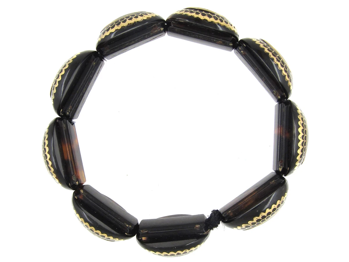 A fabulous and rare tortoiseshellAn organic material (not a shell) that is obtained, not from a tortoise, but from the overlapping horny top plates (called ‘blades’) covering the carapace (upper shell) of certain marine turtles, preferably the hawksbill turtle found of the West Indies and Brazil and the loggerhead turtle found near the Celebes. bracelet, inlaid with gold and silverA metallic element which is malleable and ductile, and white in colour, making it ideal for use in jewellery. It is usually mixed with copper to improve its hardness.